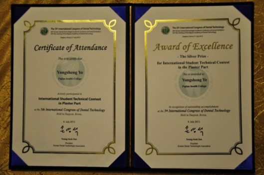 学生获第五届国际口腔技师学术大会(韩国)口腔医学技术专业石膏牙雕刻银奖