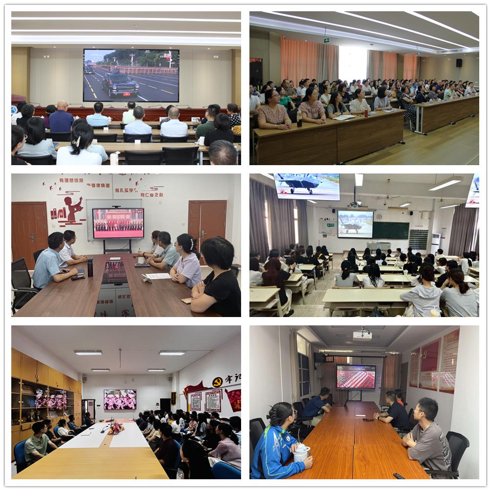 上午9时,大会正式开始,当庄严的国歌响彻屏幕,在场观看的师生眼神中充满着对胜利的致敬和对祖国的赤诚。在会议室、教室等观看点,师生们坐姿端正、神情专注,目光紧紧追随直播画面。大家全神贯注、认真聆听习近平总书记发表重要讲话。习近平总书记的重要讲话立意高远、视野宏阔,特别是“中华民族伟大复兴势不可挡!人类和平与发展的崇高事业必将胜利!”的庄严宣告,令人无比振奋,倍增奋进力量。当画面切换至威武的军队迈着整齐划一的正步走向天安门广场时,铿锵的步伐、昂扬的姿态瞬间点燃全场热情,师生们内心激荡起强烈的自豪感;一系列“国之重器”的非凡风采,让在场师生深刻感受到国家国防实力的日益强大;而当抗战老兵代表受邀出席的身影出现在镜头中,师生们纷纷动容。大家在光影交织中重温峥嵘岁月,更深刻体会到如今和平生活的来之不易,也更加坚定了珍惜当下、报效祖国的信念。