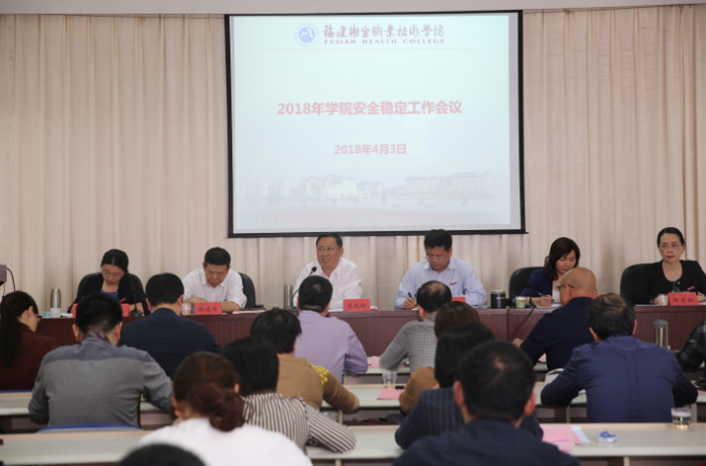 4月3日上午,学院在行政楼六楼会议室召开了2018年安全稳定工作会议。会议由黄铭珊副院长主持,院党委班子成员、全体中层干部、各系部实训中心主任出席会议。