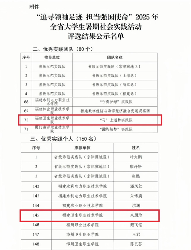 近日,由中共福建省委教育工委组织开展的“追寻领袖足迹 担当强国使命”2025年全省大学生暑期社会实践活动评选结果正式出炉,经高校推荐、专家评审等程序,我校“马”上逐梦社会实践队获“优秀实践团队”;马克思主义学院副院长来朋珍获“优秀实践个人”。