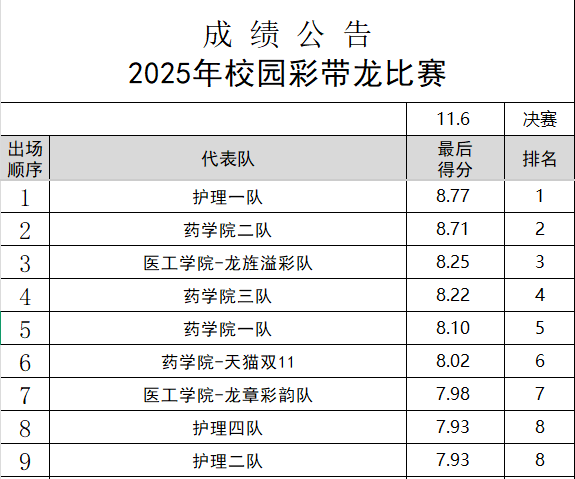 比赛现场,伴随着激昂的音乐,各参赛小队身着整齐的服装,手持中国红的彩带龙登场。队员们默契配合,时而腾跃、时而盘旋,彩带如龙身般灵动舒展,在空中划出一道道优美的弧线。“蛟龙出海”“神龙摆尾”等经典动作接连呈现,将彩带龙的刚柔之美展现得淋漓尽致。观赛师生的掌声和喝彩声此起彼伏,校园内洋溢着热烈的文化氛围。最终,护理学院一队斩获冠军。