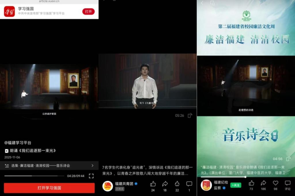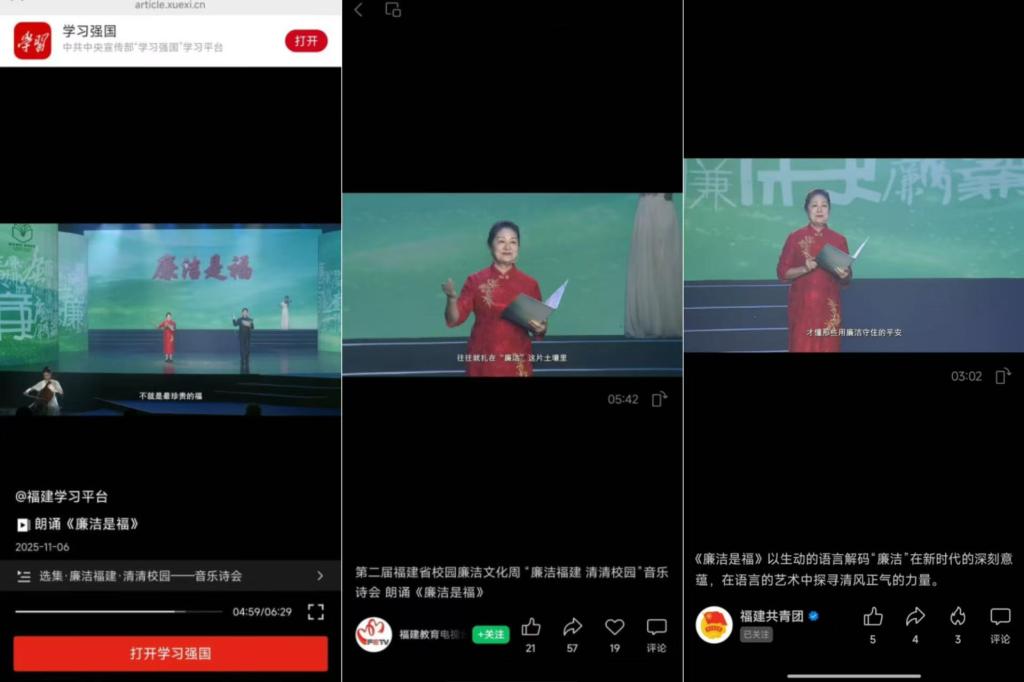 11月以来,我校廉洁文化作品持续“出圈”!学习强国福建学习平台、福建纪检监察、福建教育电视台、福建共青团等多个权威平台,相继报道我校师生参加第二届“廉洁福建・清清校园”廉洁文化周的两部精彩作品——《廉洁是福》与《我们追逐那一束光》。