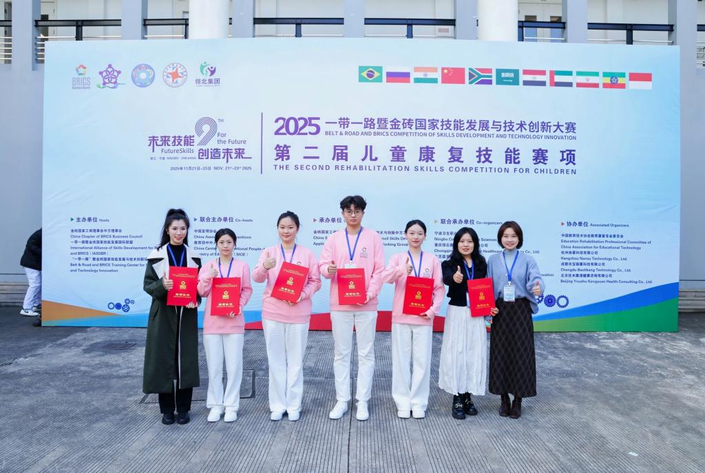 11月21日至23日,2025“一带一路”暨金砖国家技能发展与技术创新大赛第二届儿童康复技能赛项决赛在宁波卫生职业技术学院举办。大赛聚焦儿童康复核心技能与创新应用,汇聚全国多地优秀师生团队同台竞技,搭建起行业人才培养的高水平交流平台。我校高度重视、精心筹备,从选拔选手到系统集训全程发力,参赛团队斩获佳绩。