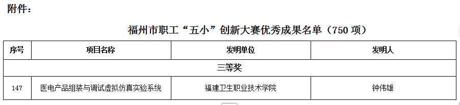近日,福州市总工会发布《关于确定2025年福州市职工“五小”创新大赛优秀成果的通知》,我校医学技术与工程学院钟伟雄老师主持开发的《医电产品组装与调试虚拟仿真实验系统》从3688个参赛项目中脱颖而出,荣获2025年福州市职工“五小”创新大赛优秀成果三等奖。