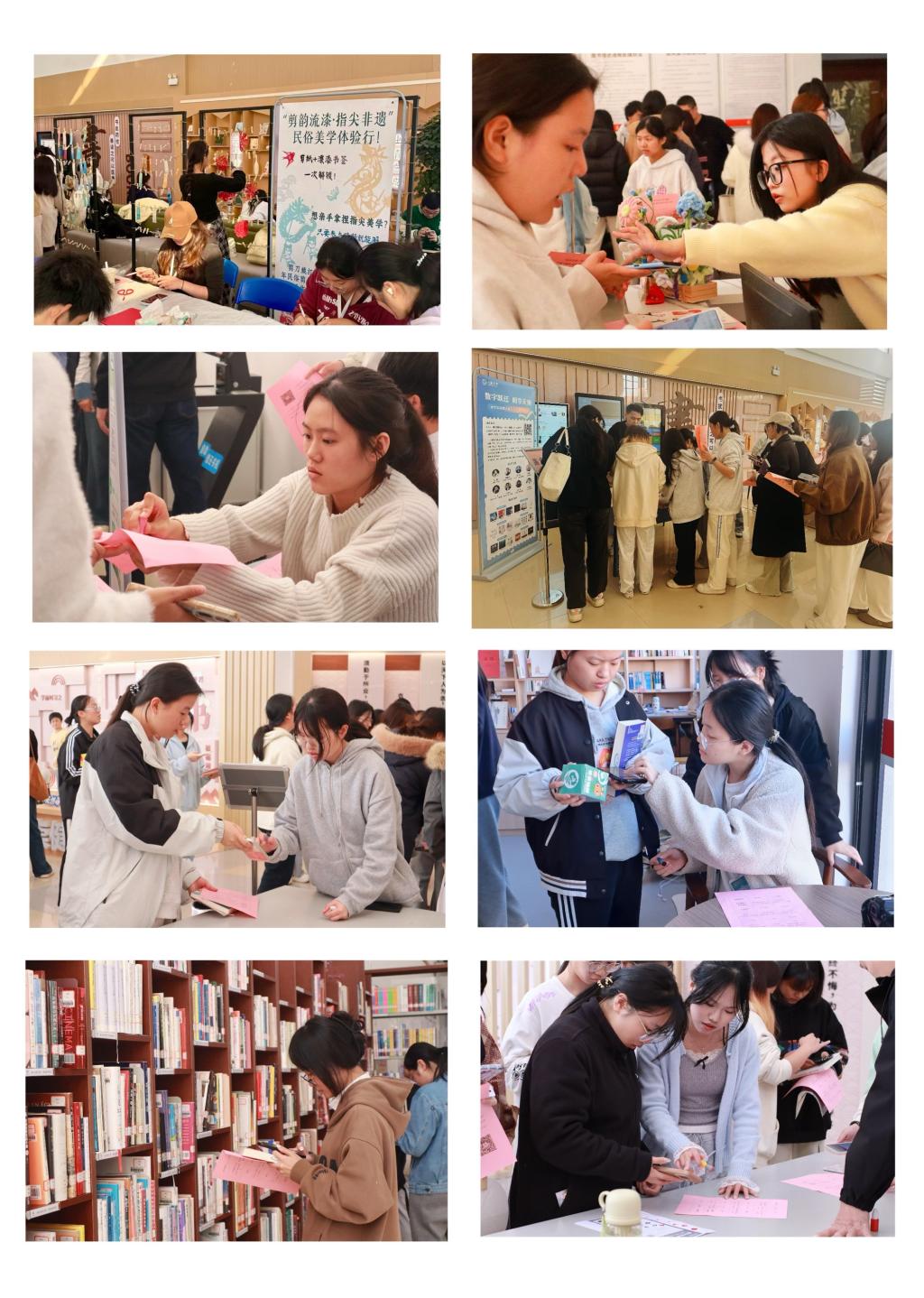 闭幕式当日,师生读者在会后移步臻善楼一楼大厅,参与图书馆同步开展的“阅见非遗·智享馆藏”馆藏文献与非遗文化推广活动。现场设置8个活动项目:“书香数智化·非遗永流传”微信扫码借书、“阅读”由你“点”读者荐书、掌上知网(中国知网)、关注万方(万方医学网)、指尖轻点(经纶知识服务)、悦读随行(中文在线)、深入人心(云图有声)和“剪韵流漆·指尖非遗”民俗美学体验互动。师生们在文献展陈里触摸文化脉络,在非遗体验中感受传统温度,于沉浸式互动里延续书香意趣。这场将阅读推广与校园文化建设深度融合的实践,也为本届读书文化节添上了生动注脚。