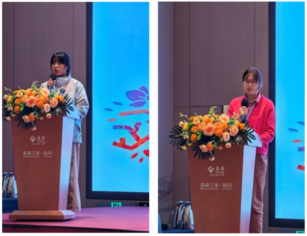 院校双方发言后,校企合作专属视频温情上线,回顾了学员一周来从熟悉园区到化身导览员的成长足迹,也串联起双方携手共育人才的合作历程。泰康之家·福园文娱活动师罗花作为讲师代表上台表态,将以新老师的身份与学员并肩同行、倾囊相授,陪伴大家共同成长;学生代表林于钰致谢学校与企业,承诺将以饱满热忱深耕专业,践行对养老事业的初心与坚守。