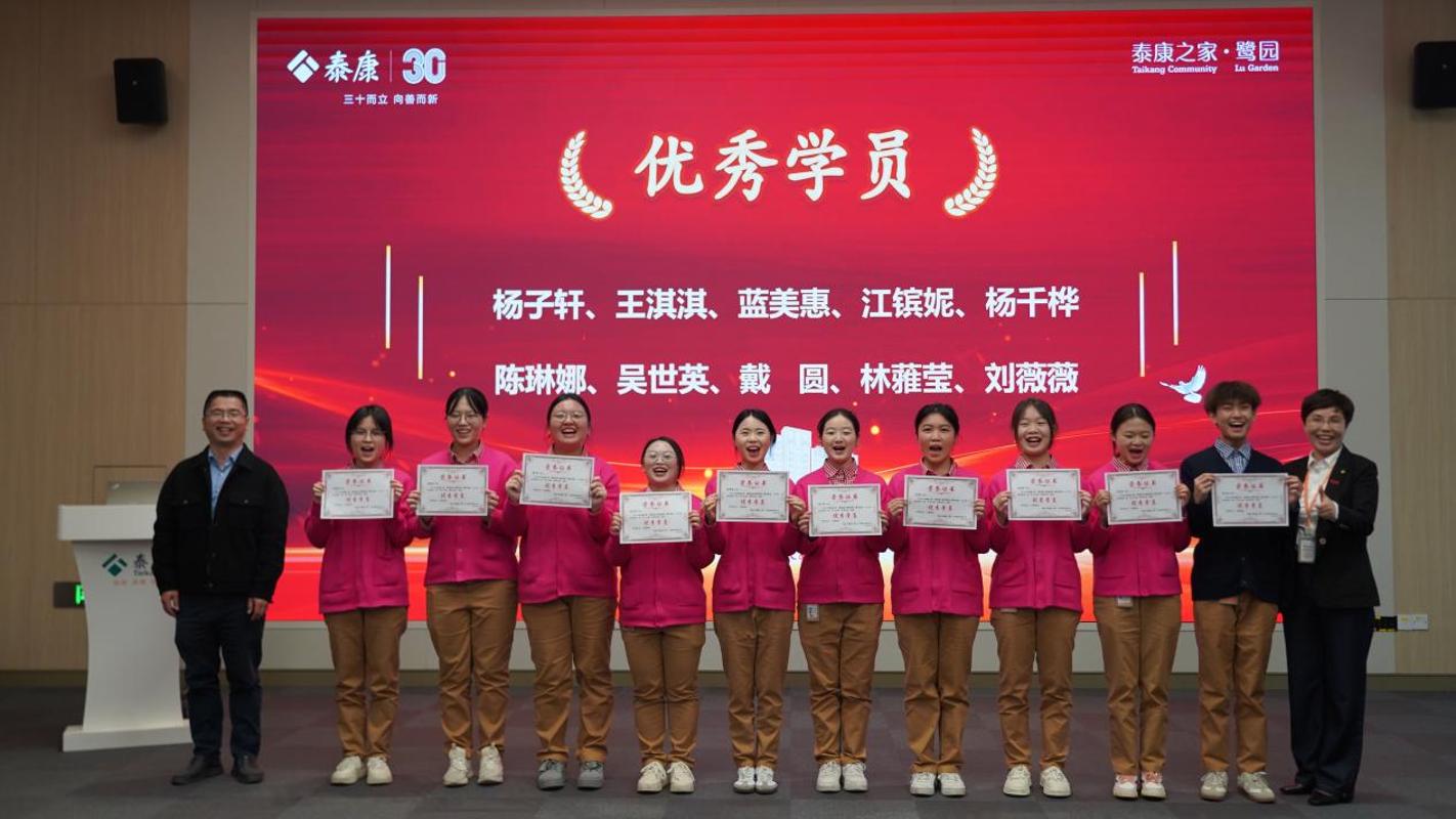 仪式上,同学们还深情朗诵了自编自导的《泰康见习行》,用青春的声音传递对康养事业的热爱与向往。最后,会议对前期新人集训中的优秀学员进行表彰,鼓励全体学生以先进为榜样,在未来的学习与实践中锐意进取、精益求精。