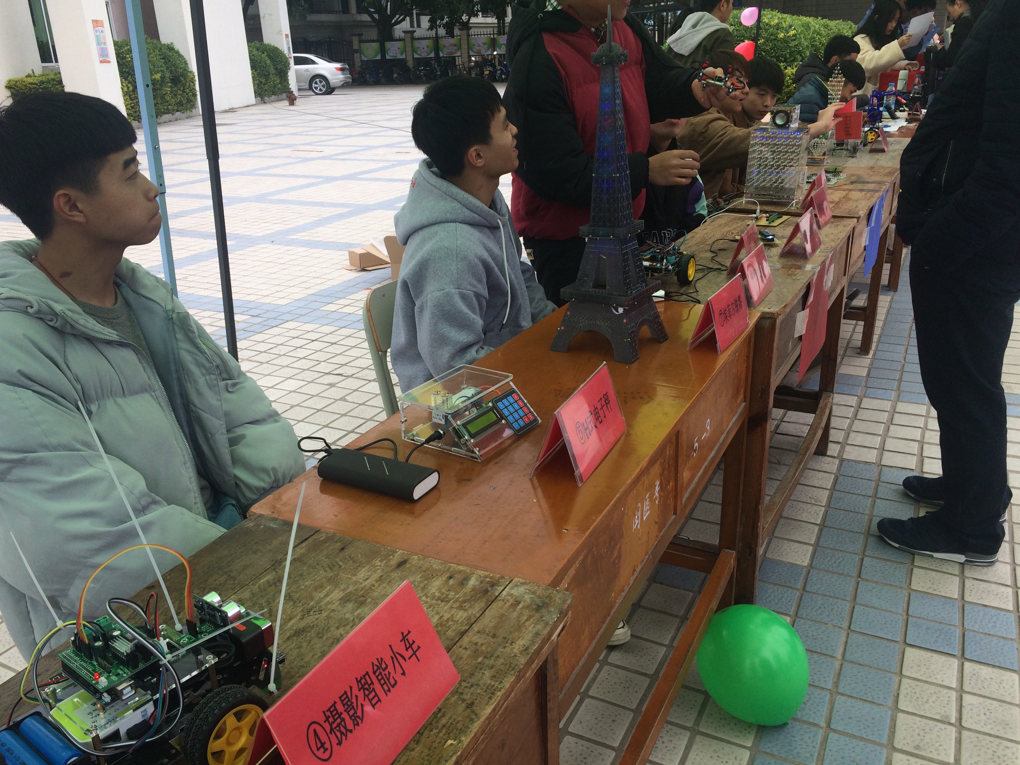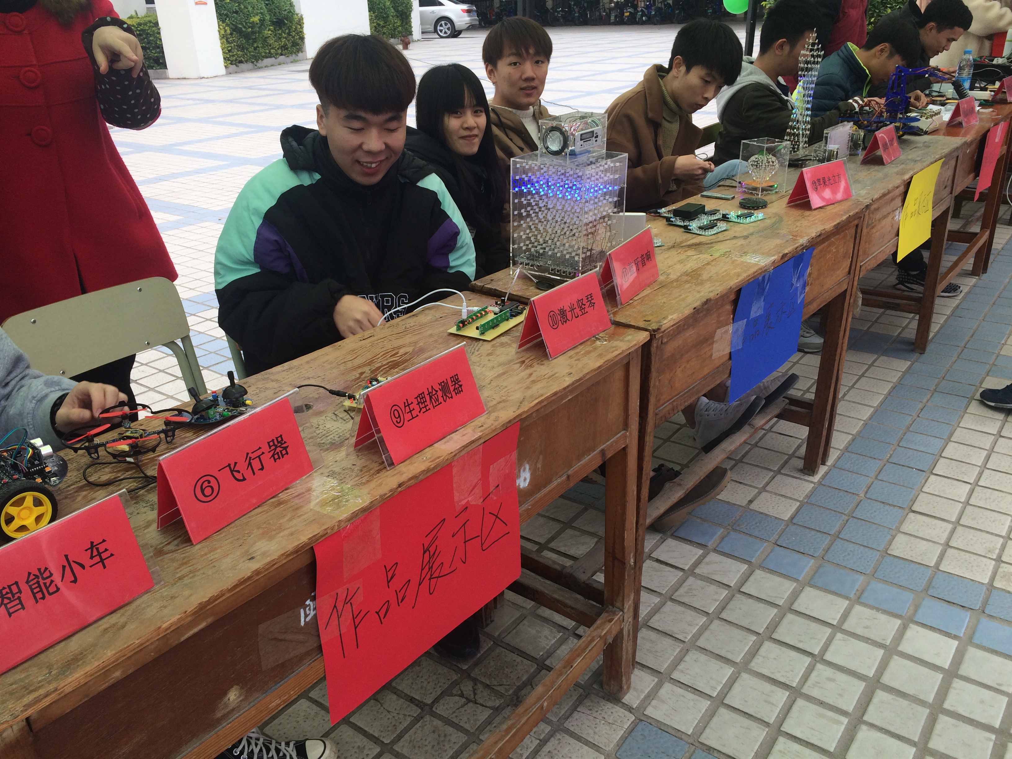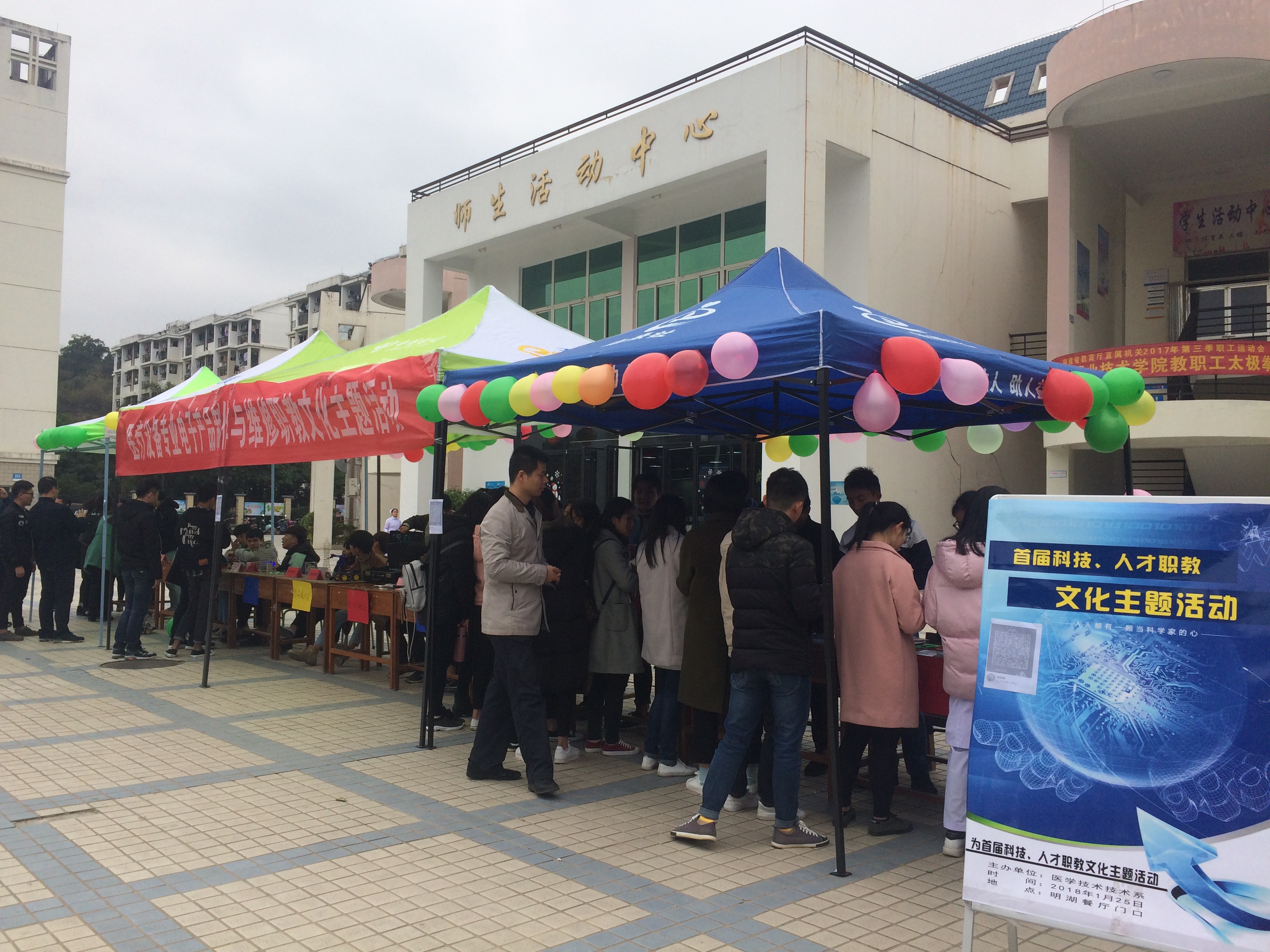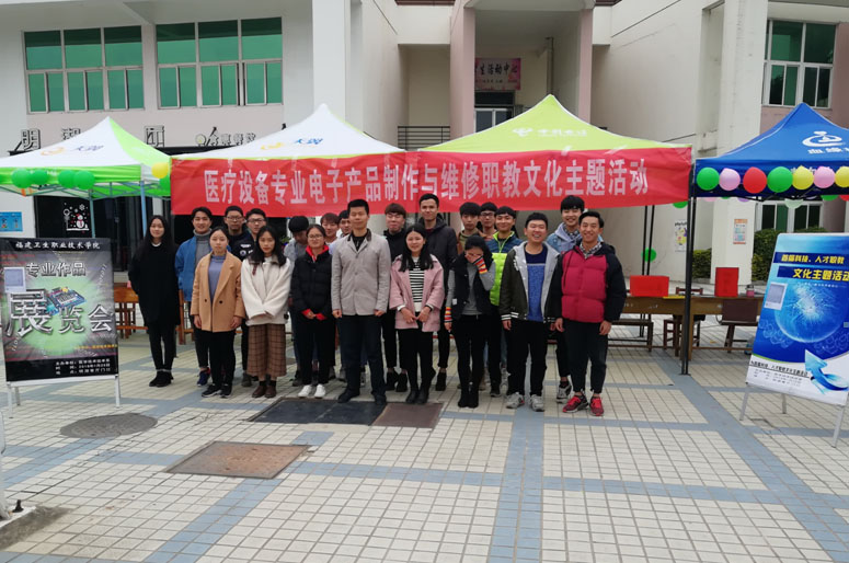 为深入贯彻落实十九大精神,推动“两学一做”教育活动常态化和制度化,弘扬“大众创业,万众创新”的时代风尚,充分发挥我系医疗设备应用技术专业的特长和优势,展现“工匠精神”,在学院和系部领导的关心和大力支持下, 1月25日上午11时至下午14时,医学技术系医疗设备专业的教师党员和全体学生在明湖餐厅门前广场开展了以“医疗家用电子产品制作与维修”为主题的职教文化活动。