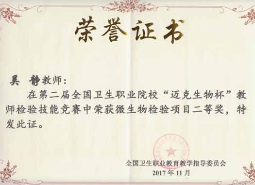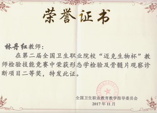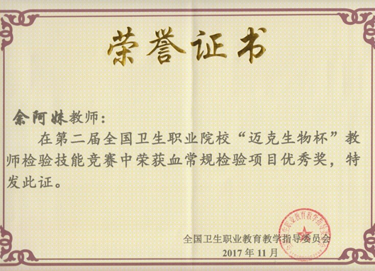 我院医学技术系余阿妹、吴静、林丹红三位老师分别参加了血常规检验、细菌分离技术与革兰染色及细菌鉴定思路、形态学检验及骨髓片观察诊断三个项目。三位选手赛前积极准备,刻苦训练,赛中克服紧张情绪,沉着应对。经过激烈比拼,最终吴静老师和林丹红老师均获得二等奖,余阿妹老师获得优秀奖。