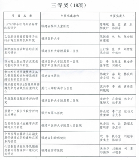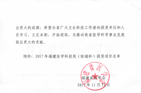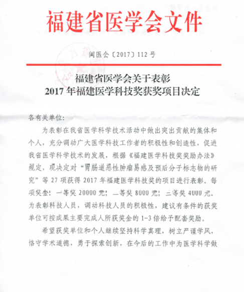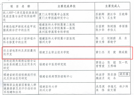 根据《福建省医学会关于表彰福建医学科技奖获奖项目的决定》(闽医会〔2017〕112号)文件通知,我院黄仁杰、肖健等老师为主要完成人的“伏立诺他原料及其胶囊剂的开发”项目喜获2017年福建省医学科技奖三等奖。