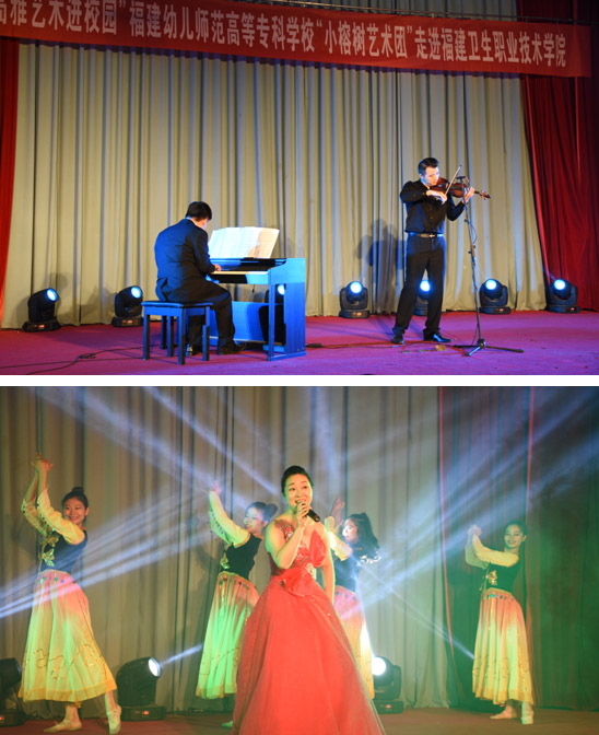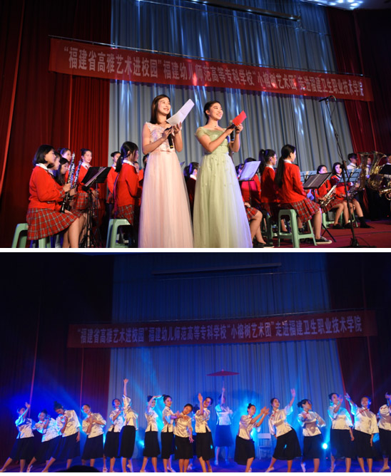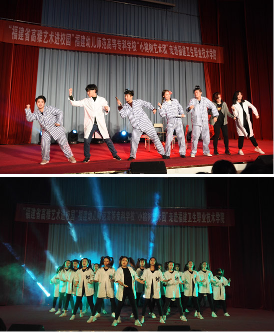 福建幼儿师范高等专科学校“小榕树艺术团”为我院师生带来了一场艺术盛宴:管乐合奏《Mission Impossible》《Accidentally in love》拉开帷幕;舞蹈《坊巷芳华》更是韵味十足;肖豆豆老师的女声独唱《一杯美酒》作为压轴,将演出推向高潮。新颖多样的节目表演出色地表现了高雅艺术的独特魅力,也把幼儿高等专科学校学子的艺术细胞展现得淋漓尽致。