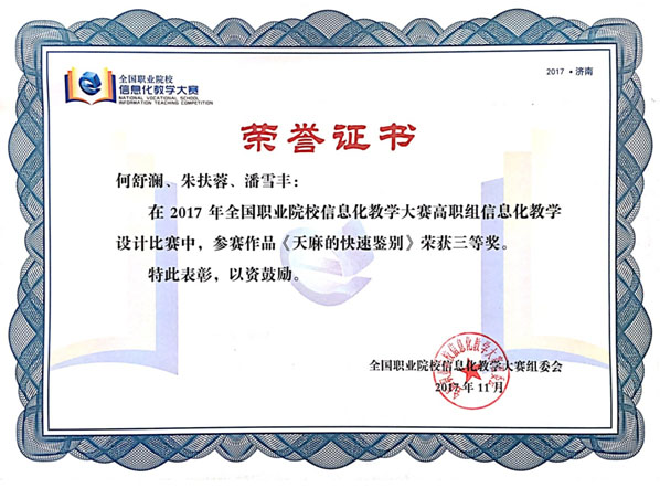 我院药学系何舒澜、朱扶蓉、潘雪丰等三位教师的参赛作品《天麻的快速鉴别》经过院赛、省赛、省选拔赛、国赛网络评审等层层选拔,最终进入决赛,并凭借先进的教学理念、精巧的教学设计、精湛的授课能力荣获高职组信息化教学设计大赛三等奖。