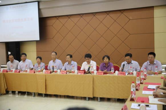 2017年9月29日下午, 原省扶贫开发协会原会长叶继革、省教育厅副厅长曾能建、省扶贫开发协会常务副会长林秀贞、常务副会长雷斌、南平市扶贫开发协会会长柳贵清、省教育厅职成处处长张文东、省扶贫开发协会秘书长陈万国、省扶贫开发协会办公室主任张毅、南平市农业局副局长林承杞、南平市扶贫开发协会副会长林孝萍、南平市妇联副主席王瑛莅临闽侯县白沙镇孔源村华窈培训基地出席我院2017级精准扶贫班座谈会。福建瑞泉护理服务有限公司总经理郑忠兵、学院党委书记曾武祈、院长苏友新、纪委书记李美华、学院相关处室负责人以及30名精准扶贫班学生代表参加了座谈会。座谈会由学院党委书记曾武祈主持。