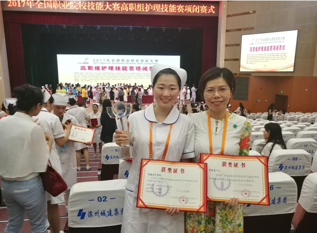 5月24日,在山东滨州举办的2017年全国职业院校技能大赛高职组护理技能赛项顺利闭幕。我院15级护理专业许懿洲同学以扎实的专业理论知识和操作技能,以及沉着稳定的发挥在140位参赛选手中脱颖而出,荣获全国一等奖,龚海蓉老师荣获优秀指导教师奖。