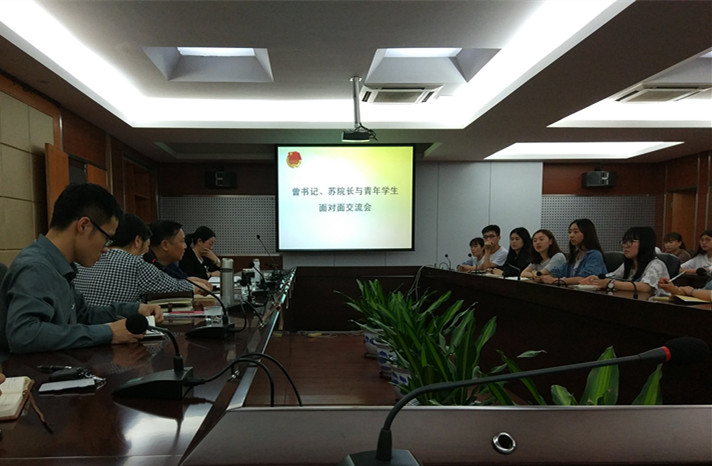5月3日五四青年节前夕,院党委书记曾武祈、院长苏友新在行政楼四楼第一会议室与青年学生进行面对面交流。副院长魏立娜、办公室主任黄铭珊、院团委副书记黄曦陪同参加会议。