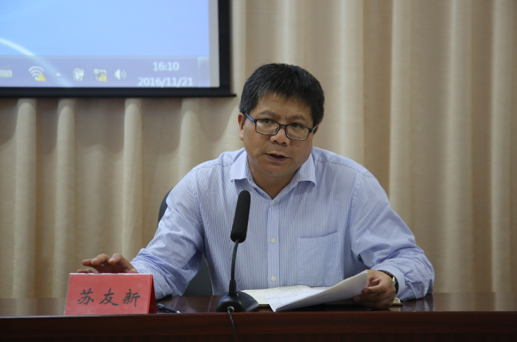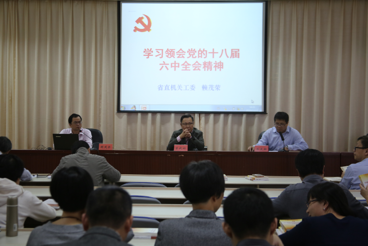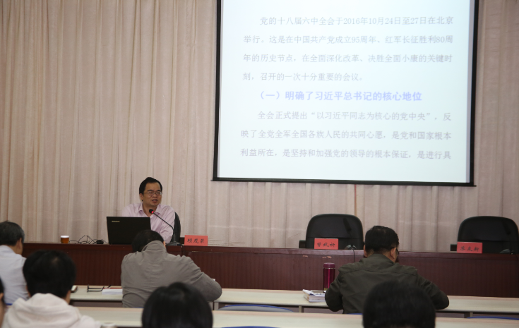 11月21日下午,我院邀请省直机关工委讲师团团长赖茂荣为学院党委学习中心组、院直机关党员作学习领会党的十八届六中全会精神专题辅导。学习会议由学院党委副书记、院长苏友新主持。