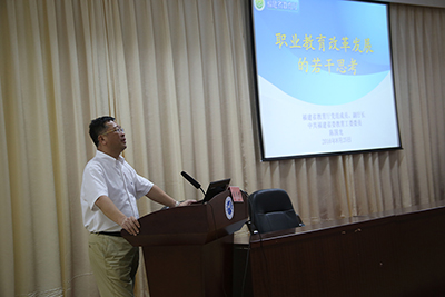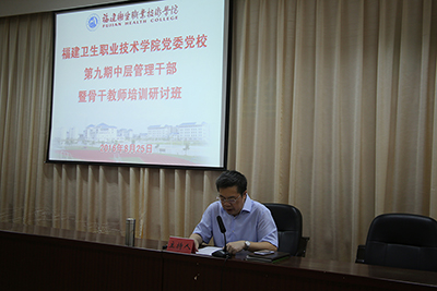 8月25日上午,学院党委书记林春明主持开班仪式。福建省教育厅党组成员、副厅长、中共福建省委教育工委委员陈国龙同志应邀来我院作题为《职业教育改革发展的若干思考》的专题讲座,从我省职业教育的改革发展机遇、问题、任务以及实践等四个方面展开,强调“十三五”期间,我省将继续坚持补短板、抓内涵、树品牌,打造福建版“二元制”职业教育。