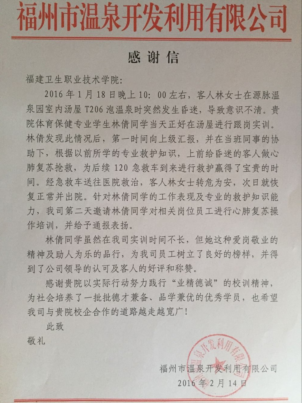 我院14体育保健301班林倩同学1月18日在福州源脉温泉园跟岗实训时发现客人林女士突然发生昏迷,意识不清,林倩同学第一时间向上级汇报,利用所学专业救护知识,迅速给昏迷的客人进行心肺复苏抢救,为后续120急救车到来进行救护赢得了宝贵的时间,经急救车送往医院救治,客人林女士转危为安。2月26日,学院收到福州市温泉开发利用有限公司寄来的表扬信。