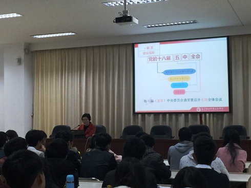 12月24日下午,院长郭素华教授为师生讲授思政课,题为《聚焦十八届五中全会学习“十三五”规划》,全体思政课教师和百余名学生到场聆听。