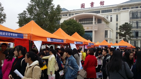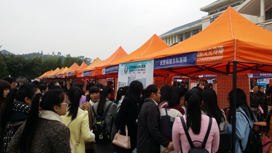 1月9日上午,福建卫生职业技术学院2016届毕业生供需见面会在校园图书馆前广场举行,吸引了全省各地147家医药卫生单位参加,提供就业岗位3000多个。招聘会现场气氛浓烈,人头攒动,多家卫生医疗单位、医药企业挤满了咨询的毕业生,用人单位也根据需求,阅览毕业生简历,与毕业生亲切交流、吸引人才。学院党委书记林春明、副院长魏立娜亲临招聘会现场,与企业相关负责人亲切交流,了解用人单位需求,各系部党总支书记和毕业生辅导员到现场与用人单位接洽沟通,为毕业生应聘提供指导和服务。福建教育电视台和海峡都市报对本次招聘会情况进行了报道。