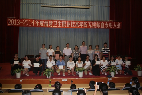 为深化校园文明创建和高校志愿服务,推动我院无偿献血活动深入开展, 2013-2014年度福建卫生职业技术学院无偿献血表彰大会于6月18日16:00在学术厅举行。福建省血液中心党委吴建忠书记、学院魏立娜副院长,省血液中心相关负责人,学院学工处、团委和相关系部的负责人出席了大会。