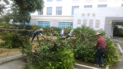 今年第13号台风“苏迪罗”在我省沿海登陆,登陆时中心最大风力为13级。面对“苏迪罗”的来袭,学院党委高度重视,党委书记林春明、院长郭素华分别部署相关部门加强安全宣传并启动抗击台风应急预案。由于准备充分、措施有力,学院在有序抗击中把损失降到了最低。