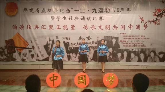 12月6日,在省直机关团工委和省教育厅团委主办的首届福建省纪念12.9运动79周年学生经典诵读比赛中,我院参赛队(陈怡欣、王婧青、张晓岚)经过认真准备,充分发挥,在有众多艺术类专业学生参赛的情况下,从中脱颖而出,以第二名的成绩获得了本科高职组二等奖。12月9日晚,我院代表队又应邀参加了纪念12.9运动79周年学生经典诵读汇报会,受到在场观众的好评,福建卫视新闻报道了我院学生的汇演实况。(团委)