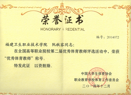 中国大学生体育协会职业教育学校体育工作委员会2014年度年会暨高职高专体育工作研讨会于2014年12月18日在广西召开,阮秋容老师在本次会议评选全国高等职业院校第二届优秀体育教师的活动中,荣获“优秀体育教师”称号。(公共基础部)