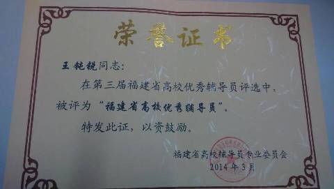 2014年4月2日~3日第三届福建省高校辅导员职业能力大赛在福建师范大学旗山校区举行。我院医学技术系辅导员杨盈老师参赛,经过紧张激烈的复赛、决赛,喜获三等奖。本次辅导员职业技能大赛,展示了学院辅导员队伍职业化、专业化的建设成果,交流了学院学生管理工作的做法和经验,是对学院学生教育和管理工作的一次检验。 另悉,经福建省高等学校思想政治教育研究会高校辅导员专业委员会评审,我院药学系辅导员王钝锐老师被评为“第三届福建省高校优秀辅导员”。(学生工作处)