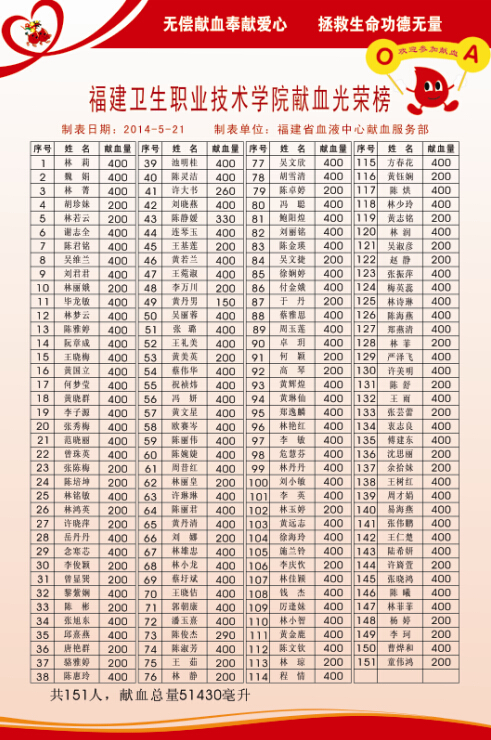 5月20日,我院与省血液中心联合开展了无偿献血活动,这是学院生命健康教育月的又一主题活动。院红十字会、学生会和血缘社社团积极宣传并组织了本次活动。本次无偿献血活动从上午11点至下午4点,共计151人献血51430毫升。 福建省血液中心同我院建立了良好的合作关系,采血车每年入校两次,每次采血量均在50000毫升以上。同时,学院志愿者长期坚持在节假日去血液中心提供志愿服务,学院师生的公益之心和奉献精神得到了血液中心的认可和好评。 (院团委)