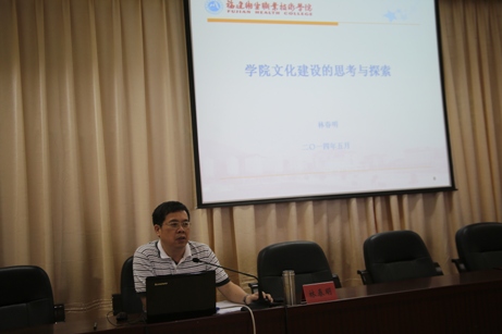6月3日下午,学院党委书记林春明应邀在行政楼六楼为全院师生作题为《学院文化建设的思考与探索》的讲座。全院副高级以上职称人员、副科级以上干部、教研室主任、辅导员及部分学生代表200多人聆听了讲座,讲座由副院长廖伟坚主持。