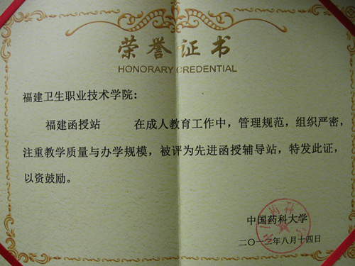 2012年中国药科大学成人教育学院函授站工作年会上传来喜讯:中国药科大学福建函授站(设在我院)被中国药科大学评为先进函授辅导站,并受到表彰。 中国药科大福建函授站自建立以来,严格执行中国药科大成人教育学院的有关规定和要求,不断完善组织保证,提高办学条件,壮大师资队伍,强化教学管理,规范财务制度,不断提高成人高等教育人才培养质量和声誉,使得函授站教学质量持续提高的同时,为建设学习型社会、构建终身教育体系做出积极贡献,也赢得了良好的社会声誉。(教务处)