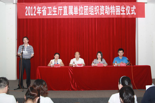 6月14日下午,2012年省卫生厅直属单位团组织资助特困生仪式在我院明湖师生活动中心隆重举行。卫生厅直属单位各团组织的代表和受资助学生参加了仪式。院党委陈雄副书记、省卫生厅团委陈晓芩书记、院学工处黄铭珊处长、院团委宋维副书记出席。