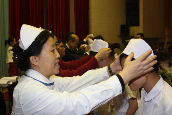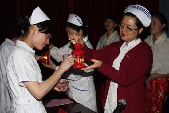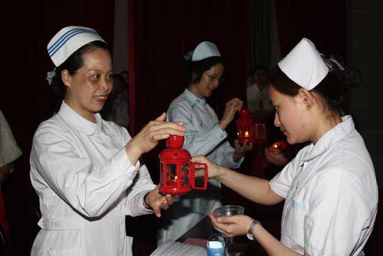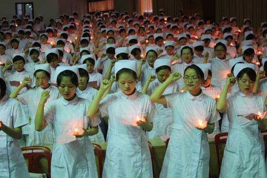 “我宣誓,遵守护士的职业道德规范,象南丁格尔那样,以一颗同情心和一双愿意工作的手,以真心、爱心和责任心对待每一位病人……”5月11日下午,在学术报告厅,护理系583位毕业生戴着象征着圣洁的天使的洁白燕帽,接过前辈象征着“燃烧自己,照亮他人”的红烛,举起右手,庄严宣读毕业生誓词。