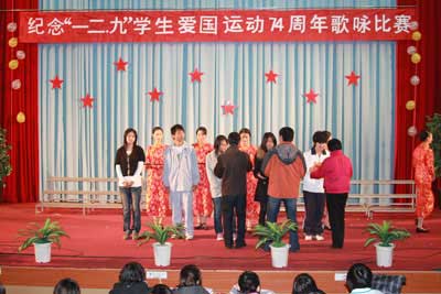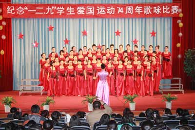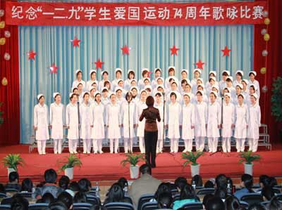 为了纪念“一二九”大学生运动74周年,弘扬当代大学生爱国主义精神,陶冶爱国情操,我院团委于12月9日在学术报告厅举办了“纪念一二.九爱国运动74周年”歌咏比赛。莅临本次比赛有魏立娜副院长、党委工作部、办公室、学工处、团委、图书馆、系(部)负责人,以及班主任辅导员等。