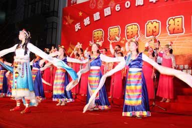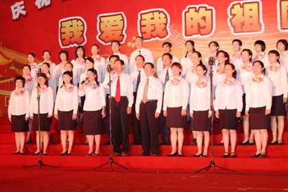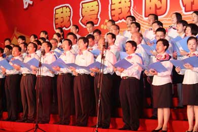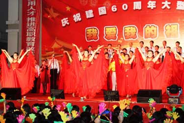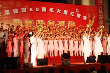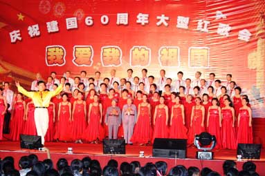 9月29日晚,由院党委主办、党委工作部、团委、工会共同承办的“我爱我的祖国——庆祝中华人民共和国成立60周年师生大型红歌会”在学院图书馆前广场隆重举行,卫生厅枫叶合唱团、附属医院、73919部队和我院师生组成的13支代表队参加了演出,省卫生厅陈秋立副厅长,原卫生厅崔华副厅长、人事处黄俊章处长,附属医院季晓林院长、林建团书记、共建部队汪政委、政治部陈主任及学院党委严肃书记、林春明院长、陈雄副书记、廖伟坚副院长、黄开良副院长等领导和学院师生3000多人欢聚一堂,共庆祖国60华诞。 红歌会在各方块队伍拉歌声拉开帷幕,省卫生厅枫叶合唱团雄健洪亮的歌声中一曲红色经典歌曲大联唱《希望》,唱出了党在新中国成长历程中不可磨灭的功勋,附属医院歌伴舞《走进西藏》让人领略了藏族姑娘的优美舞姿、附属医院大合唱《祝福祖国》和《山丹丹花开红艳艳》,共建部队演唱的《爱国奉献歌》和《工化兵之歌》,院直机关、公共基础部、药学系、护理系、检验影像系、医学基础部临床医学系合唱队演唱的《爱我中华》、《没有共产党就没有新中国》、《团结就是力量》等经典红色歌曲在舞台上此起彼伏,师生们在一段段熟悉激昂的主旋律中,一起回到那激情燃烧的岁月,在红歌世界中体味感动与爱国激情。 近2个小时的合唱比赛气氛热烈、欢声迭起,全体教职工齐上阵,师生同台传唱红色歌曲,不断舞动的红旗让会场成了红色的海洋。晚会在全体放声高歌《歌唱祖国》的雄壮豪迈的歌声中圆满落幕。 这台红歌会以喜庆、隆重、昂扬、热烈为基调,以歌声、掌声、表演为烘托,充分表示了全院师生对伟大祖国60华诞的喜庆之情。(党委工作部 团委 工会)
