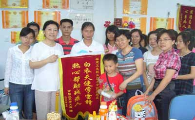 我院05级护理五年专志愿者于2009年4月11日义卖《东南快报》共筹得善款4291.5元人民币,该善款已全部用于资助闽侯县上街镇马排村的金榕燊兄弟俩(金榕燊系先天神经性耳聋, 哥哥患精神分裂症),2009年6月25日下午,金榕燊兄弟的母亲和金榕燊兄弟俩带着感恩的心来到我院护理系,并为我们送来了锦旗。护理系主任刘登蕉、书记谢涛、办公室主任王珊珊、05护理五年专的辅导员赖文金等系部老师和任慧等学生代表热情接待了他们,并为两兄弟送上了生活及文化用品。