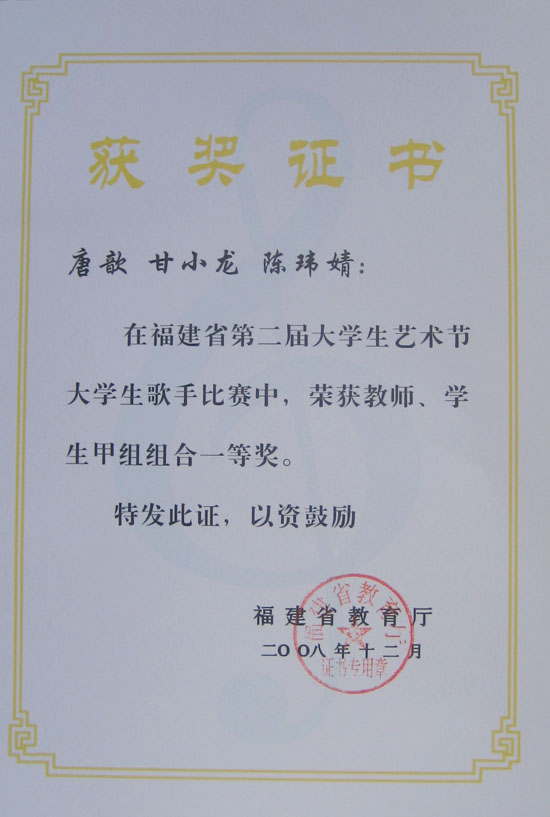 我院大学生艺术团“明湖组合”(唐歆、甘小龙、陈玮婧)在参加由省教育厅举办的福建省第二届大学生艺术节大学歌手比赛中,荣获教师、学生甲组组合一等奖(指导老师:邱滚忠)。