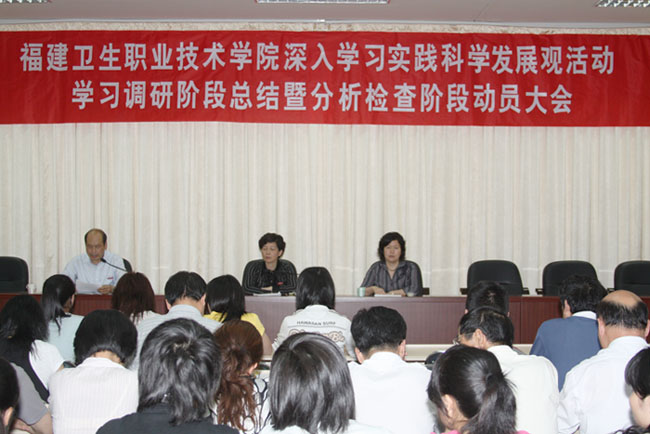 5月14日,我院召开深入学习实践科学发展观活动第一阶段总结暨第二阶段动员大会。福建省卫生厅学习实践科学发展观活动检查组高榕芳副调研员莅临指导。院领导陈雄同志主持大会,院党委严肃书记作学院深入学习实践科学发展观活动第一阶段总结和第二阶段动员报告。