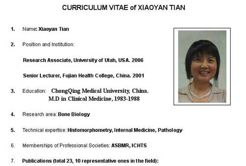 田小燕女士毕业于重庆医科大学,原为我院病理学高级讲师,2000年到美国犹他大学任访问学者,现为美国犹他大学医学院副研究员,长期从事骨生物学研究,尤其在组织形态学、病理学、内科学等方面具有专长。