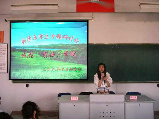 药学系于4月8日下午在系部第一阶梯教室举行题为“诚信、责任、奉献”的学生专题研讨会。担任本次研讨会的评委老师有党总支欧春木书记、公共基础部陈洁、洪斯汶、黄海云、施汉生老师以及各班辅导员,研讨会由04药学502班的廖微主持。