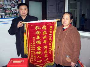 1月18日下午王配剑母亲在检验影像系马清璇老师、傅衍达老师的陪同下前往美可普义齿制作有限公司,公司负责人将捐款交于王配剑母亲手中。王配剑母亲将感激之情述于锦旗之上,表示十分感谢社会爱心人士,有这么多的爱心支撑,王配剑有信心战胜病魔,创造生命的奇迹!王配剑的母亲亲手将锈有“捐款救命传达爱心 弘扬美德震撼人心”的锦旗交到美可普义齿制作有限公司领导的手中。(检验影像系)