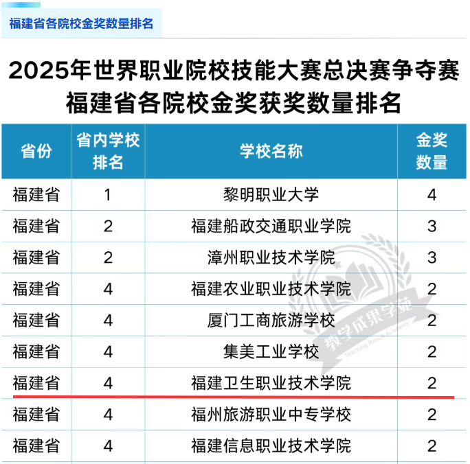 近日,世界职业院校技能大赛总决赛落幕,全国各省份及院校的获奖榜单正式发布。在本次大赛中,福建省共摘得33枚金牌,位列全国第十。福建卫生职业技术学院以2枚金牌的佳绩,排名全省第四,取得了里程碑式的成就。