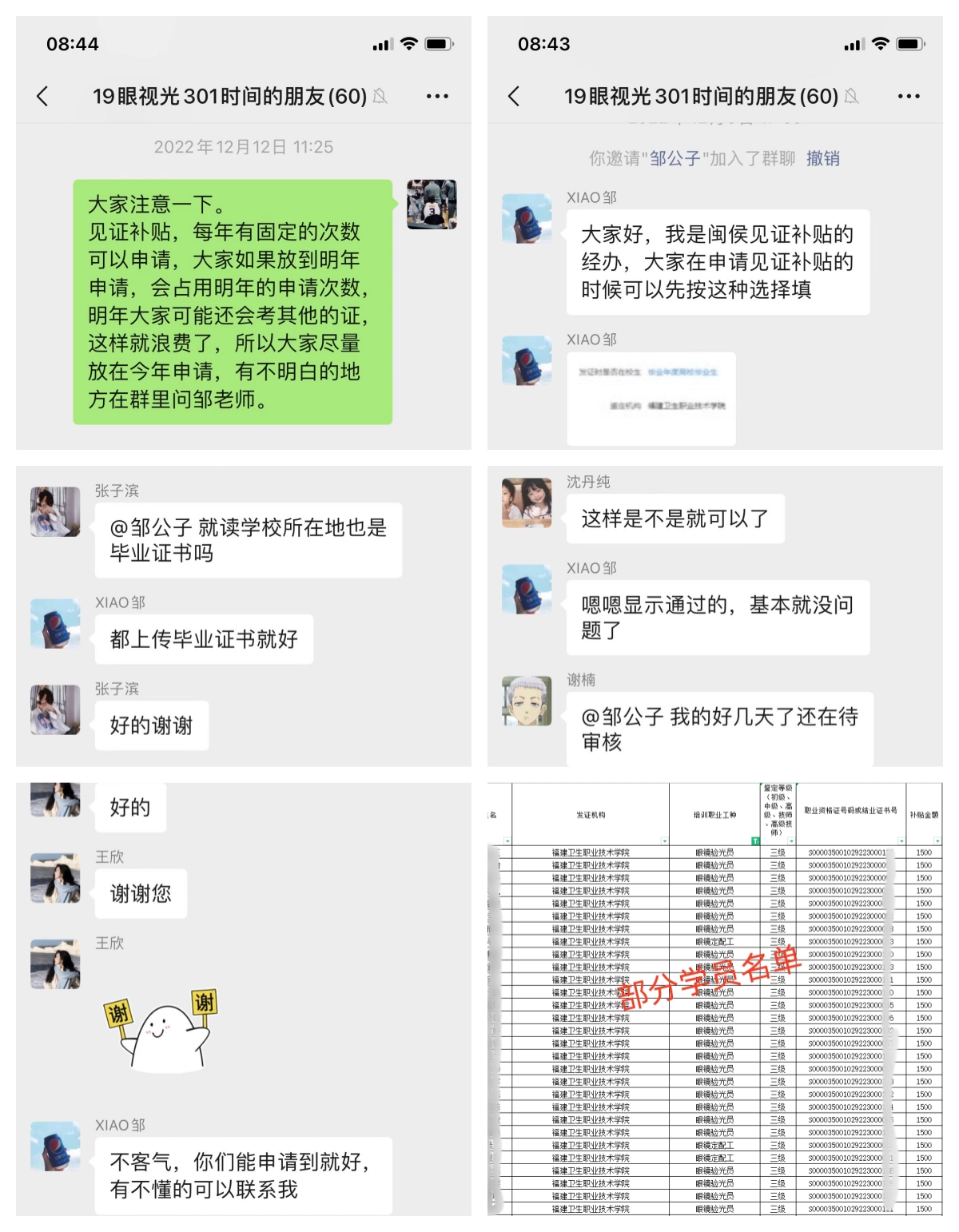 据悉,以往应届毕业生“见证补贴”资金申领需前往户籍所在地人社局申请,且各地补贴资金申领政策差异较大、申请程序繁琐等原因大大降低了学生的申请意愿。我校在了解情况后,由继续教育学院联合医学技术系成立眼视光专业学生“见证补贴”工作专班,创建微信服务工作群,并邀请闽侯县人社局审核专员入群指导。针对学生提出的各项问题闽侯县人社局给予了悉心指导,解决学生在证书补贴申领流程上的诸多疑问,大大提升了申领效率,打通证书补贴资金申领“最后一公里”。截至目前,我校共有126名学生成功申领补贴,三级证书(高级)每人可领取补贴1500元,合计补助金额189000元。