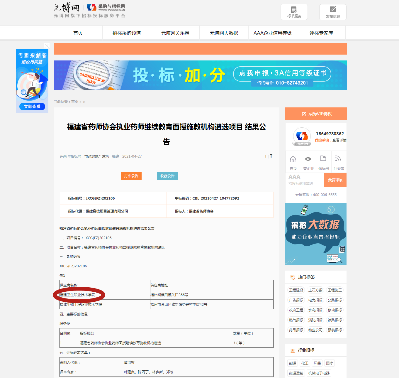 近日,福建省药师协会执业药师继续教育面授施教机构遴选项目结果公告,我校凭借突出的办学条件、雄厚的教学实力以及良好的市场信誉,得到福建省药师协会和评标专家的认可,在众多竞争对手中脱颖而出,以评分第一的成绩中标福建省药师协会执业药师继续教育面授施教机构。这是我校首次以投标人的身份参与行业培训机构项目遴选。此次项目中标给我校今后参与行业培训项目遴选积累了宝贵的经验。