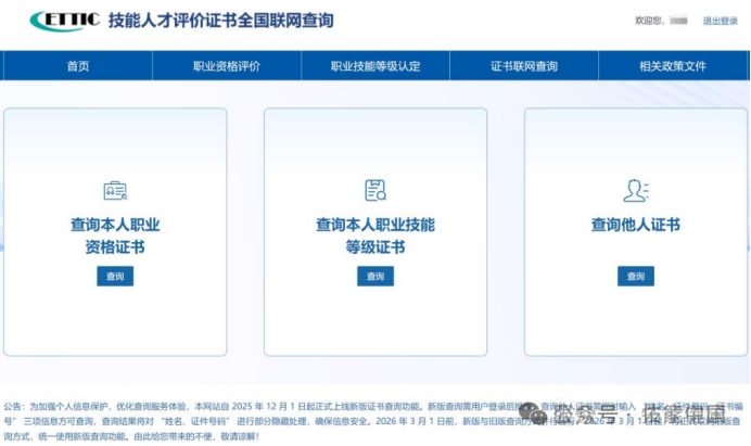 为保障个人信息安全,2025年12月1日技能人才评价工作网站新版证书查询功能上线。新版证书查询方式说明如下: