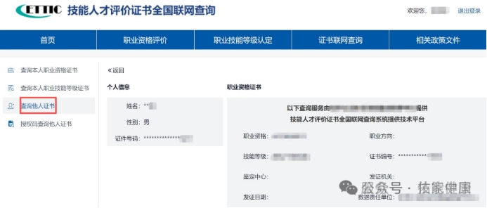 路径:登录后→左侧菜单栏→【查询他人职业资格证书/查询他人职业技能等级证书】步骤: