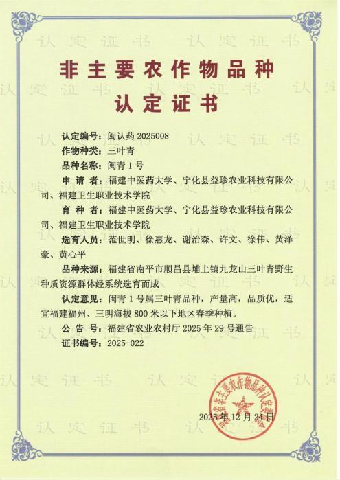 近日,我校联合福建中医药大学、三明市宁化县益珍农业科技有限公司成功选育的三叶青新品种“闽青1号”,正式通过福建省非主要农作物品种认定委员会认定。这标志着学校在特色药用植物种质资源创新与产业化应用领域取得新突破,为推动科研成果从实验室走向田间地头、服务区域医药产业发展注入强劲动力。