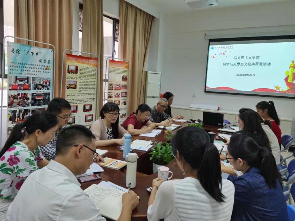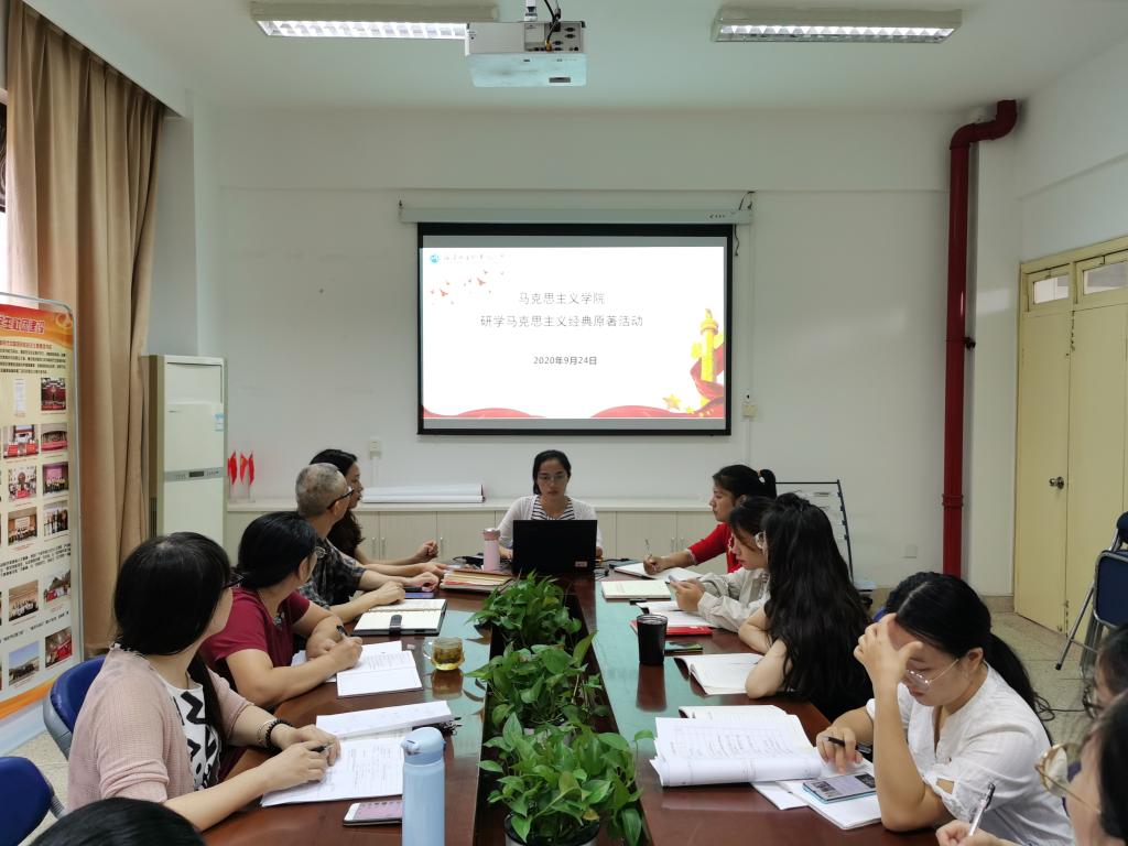 2020年9月24日上午,马克思主义学院全体思政教师在会议室举行了第三次马克思主义经典原著研学活动,此次活动由马克思主义学院院长熊美兰主持,形势与政策教研教师张茵珠主讲。