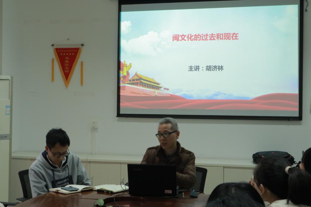 为深入学习贯彻习近平文化思想,让同学们更深入理解福建悠久的历史、五彩斑斓的闽文化,培育爱国情怀,坚定“四个自信”,2024年1月25日,胡济林副教授在行政楼107室为马克思主义学院“闽文化探源”社会实践队举行《闽文化的过去和现在》专题报告。